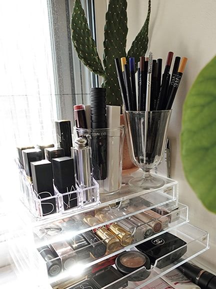 「ポーチに入りきらない化粧品は、無印良品のアクリルケースやヴィンテージグラスの「透明」なものに入れて収納。ごちゃごちゃひっかきまわさずとも一目でどこにあるか把握できるので、キレイな状態を維持しやすい」(曽根加南子さん・フリーPR)