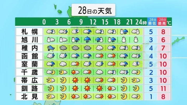 道南は雨、札幌や旭川は朝晩を中心に雪というように、場所や時間によってマークを使い分けています。