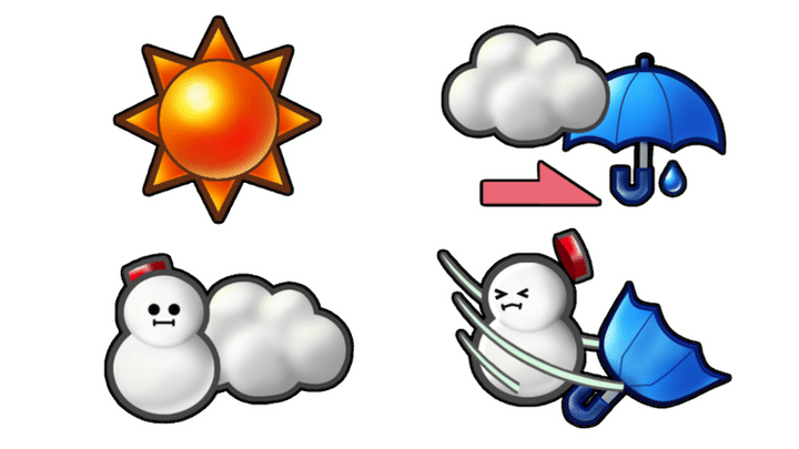 HBC天気マーク一例。上段は左から「晴れ」「曇りのち雨」。下段は左から「雪時々止む」「雪か雨で暴風を伴う」。HBCで使用している天気マークはなんと130種類以上あります!## 雪と雨を分けるカギは「-6℃」