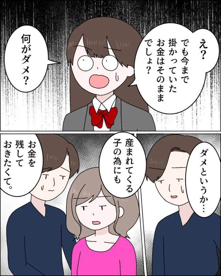 すると、「え?でも今までかかっていたお金はそのままでしょ?何がダメ?」と言うジュリちゃんに、「ダメというか・・産まれてくる子のためにも、お金を残しておきたくて」ケイさんが気まずそうに答えると、