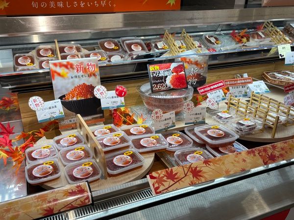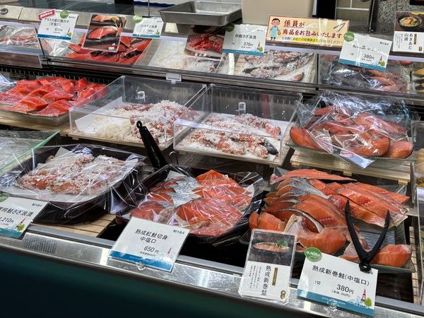 北海道産天然鮭を中心にした海産物を販売する佐藤水産。切り身やいくらの醤油漬が輝きを放っています。新鮮なあれこれに目が釘付けに!