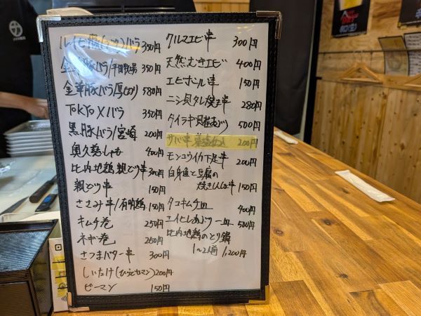 早速気になる7種類(豚バラ、鳥肝、砂ズリ、鳥もも、せせり、フリソデ、つくね)を注文しました。1本100円というお値段にも関わらず、作り置きは一切せずに、全て注文を受けてから焼きます。