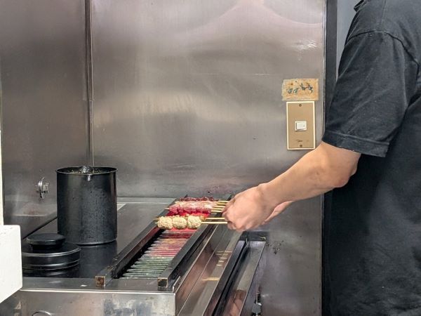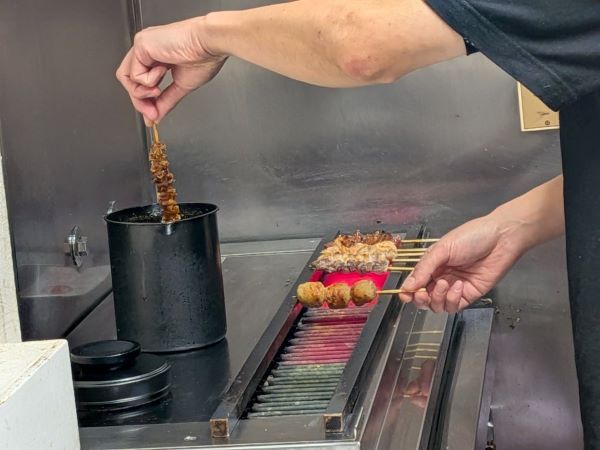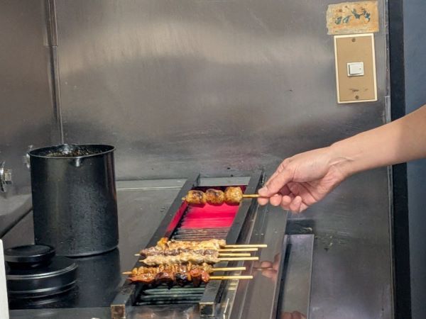 豚バラ、鳥肝、つくねなど、たれ味のものは、2度たれに付けて焼きます。
