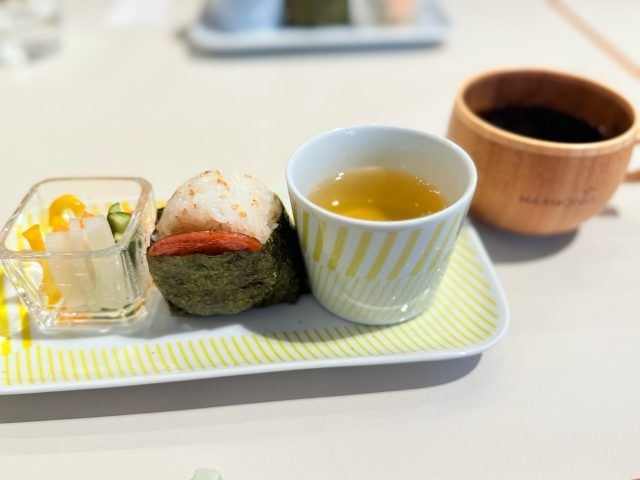 プレートの右は、長崎といえば、あごだしスープ!真ん中は雲仙ハムのおにぎり。左は無農薬お野菜のピクルスです。