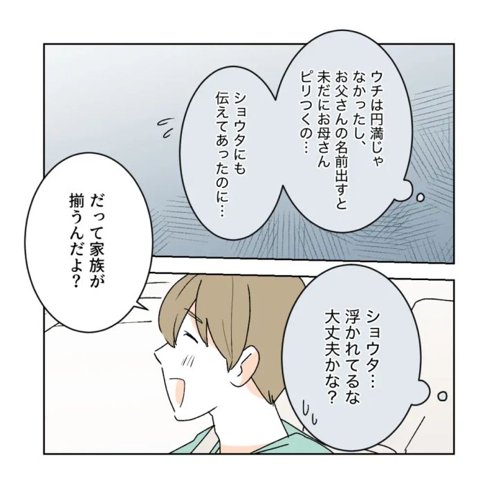 私は円満ではなかった両親が離婚に至るまでをはっきり覚えていて、離婚してからも未だにお母さんはお父さんの名前が出るとピリつくことが分かっています。私自身だってそんなに仲良くはないことを、ショウタにも伝えてあったのに「だって家族が揃うんだよ?」と嬉しそう。『病気の』義父がさんざん食べ散らかした飲食代やタクシー代を払うほど浮かれているショウタを横目に、私は心配になってきました。
