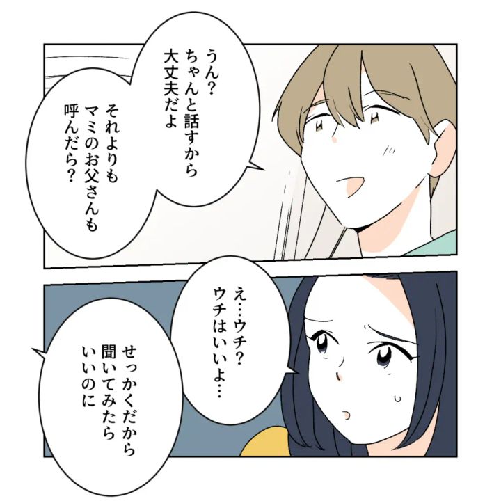 義母にはちゃんと話すから大丈夫と軽く言うショウタは、父は呼ばないと決めている私にまで「マミのお父さんも読んだら?」と言ってきました。父親との再会がよほど嬉しかったのか、私にも「せっかくだから聞いてみたらいいのに」と言うのです。