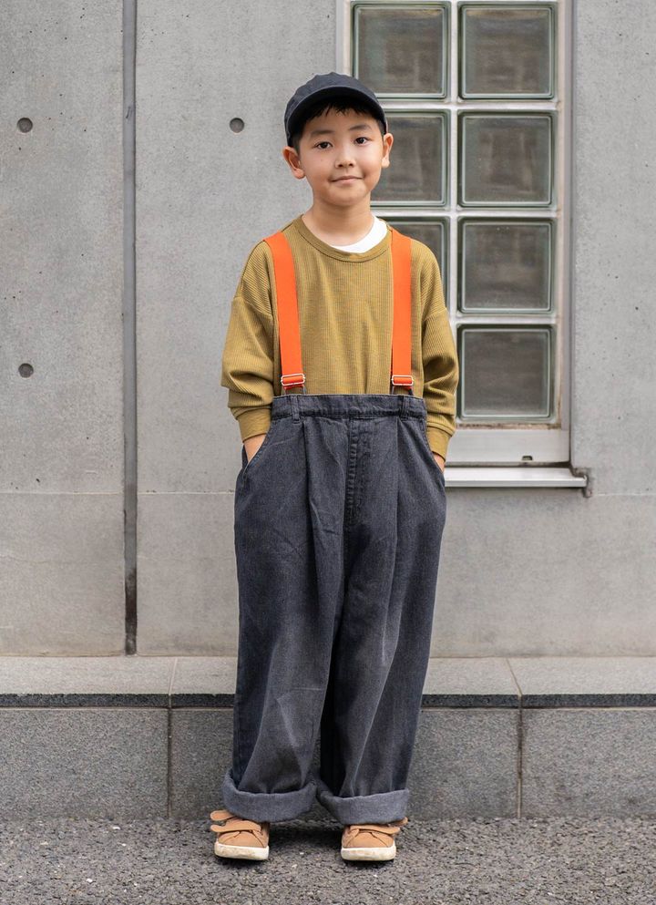 元気いっぱいのオレンジを小物にチャージした、さりげないリンクがおしゃれ! ママは洗練カジュアルにまとめ、キッズはレトロムードを楽しみつつ、オールインワンのシルエットをシェアして統一感ある親子コーデに昇華♪