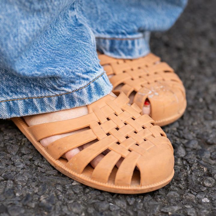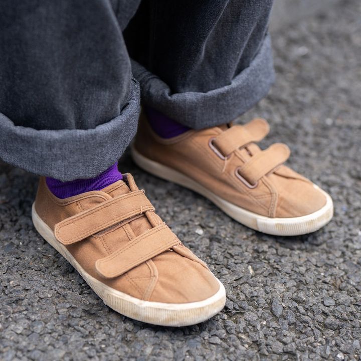 ロールアップしたデニムにキャメルのシューズを投入! ヴィヴィットカラーのソックスで引き締めつつ、こなれ感ある足元にアップデート。