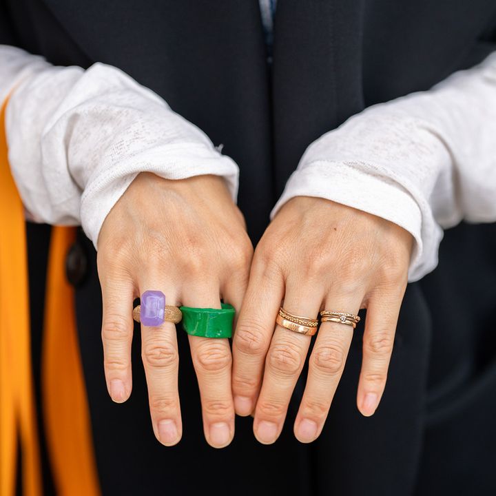 カラフルなリングで手元を華やかに演出! 『ノグチ』や『エルメス』、ハンドメイドのリングをレイヤードして、ブラックコーデのアクセント役に抜擢。