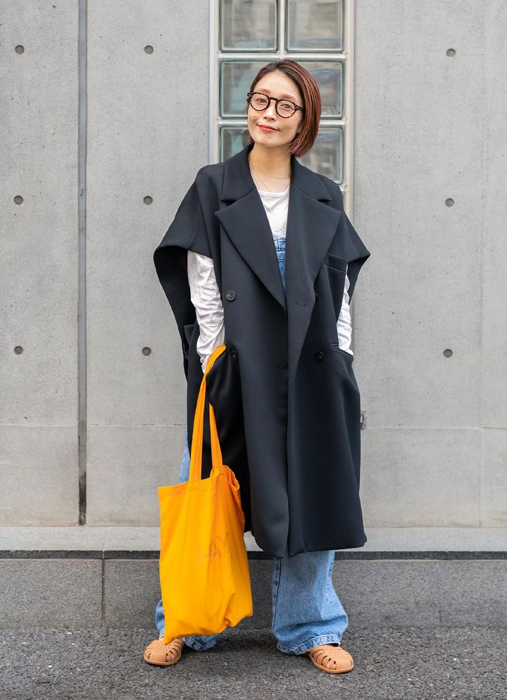 編みのシューズでリラクシーな足元にまとめ。緊張感のあるアウターに対して、バランスを取ったのがグッド!