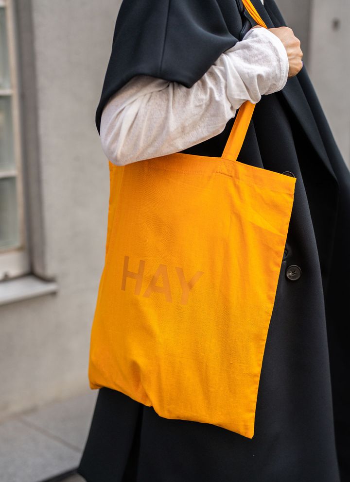 ジューシーなオレンジのトートバッグが存在感抜群! 秋の街に溶け込む洗練されたカラーは挿し色にぴったり♪