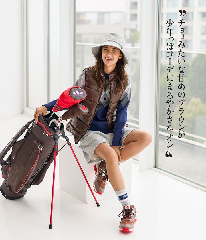 ベスト¥27,500、ソックス¥1,650、シューズ¥24,200〈編集部調べ〉、キャディバッグ¥59,400〈編集部調べ〉、ヘッドカバー各¥7,700(以上アディダスゴルフ) ニット¥19,800(アドミラルゴルフ/ヤマニ) パンツ¥20,900(ダブルスタンダードクロージング/フィルム) ハット¥18,700(ルフィルスポーツ/ルフィルニュウマン新宿店)