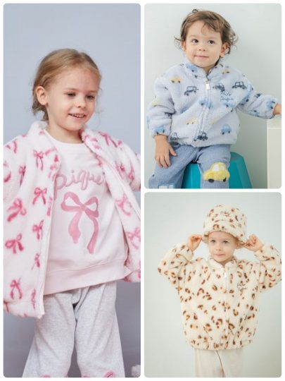 ベージュはヒョウ、ピンクはリボン、ブルーは車プリントをあしらったフリースブルゾン。あたたかなフリース素材×スタンドカラーで外遊びにも大活躍しそう!ゆとりのあるサイズ感で、厚手のインナーを着せても問題なし。90センチから120センチまでサイズをご用意しているので、姉妹・兄弟でリンクコーデしても可愛いです♡