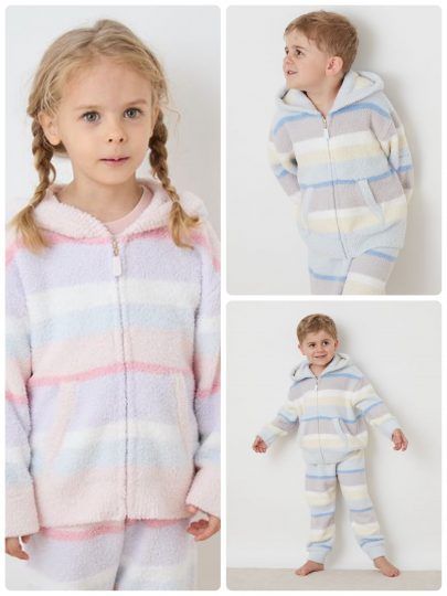 カラフルなボーダー柄で寒い季節をハッピーに♡もっちり柔らかな質感のベビモコシリーズのパーカは、レディース&ベビーラインとリンクコーデが叶うので親子で楽しめます。ふっくら軽い素材感で、着心地を重視するお子さんも満足するはず。袖にはロゴ刺繍もプラス。