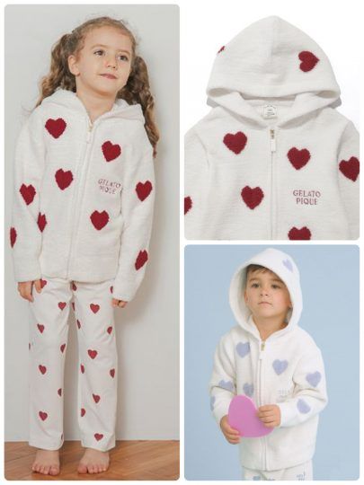 GELATO PIQUEで大人気のエアリーモコシリーズをキッズラインでも!大きなハート柄を散らしたキュートなパーカは、同柄でBABYサイズのポンチョも展開しているので赤ちゃんともリンクコーデができちゃいます。同柄のボトムをセットアップで着こなすのも可愛い!