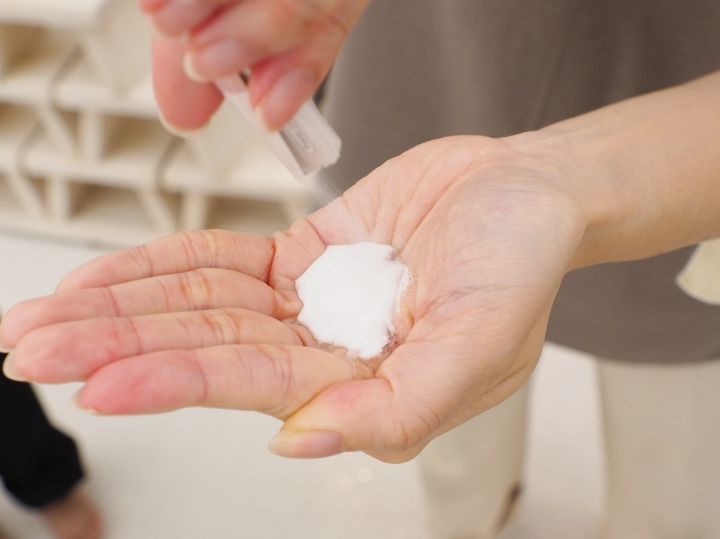 この2つのモードの間に使うのがmelt の“生炭酸(※1)シャンプー”こと「メルト クリーミーメルトパウダー」です。手のひらに水を溜め、パウダーをのせた瞬間からモコモコと泡立ってきます。