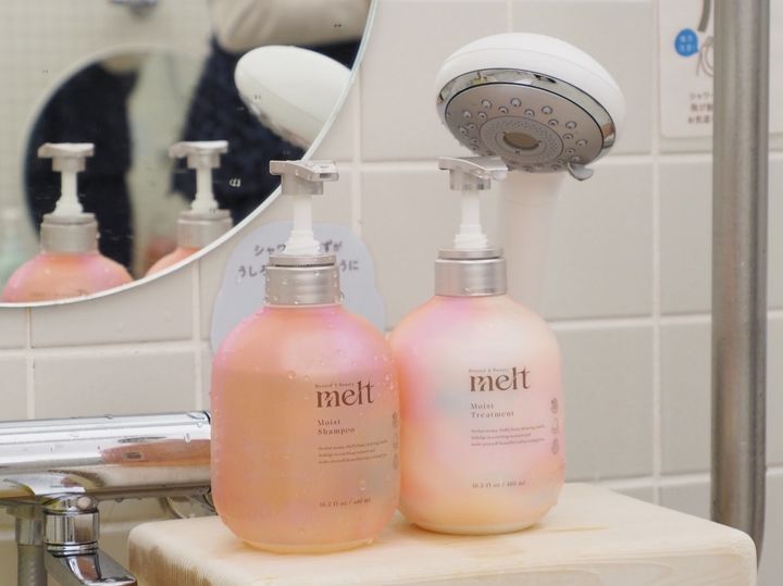 いざ浴場に入ってみると、あちらこちらにmeltのシャンプーとトリートメントが置かれています。