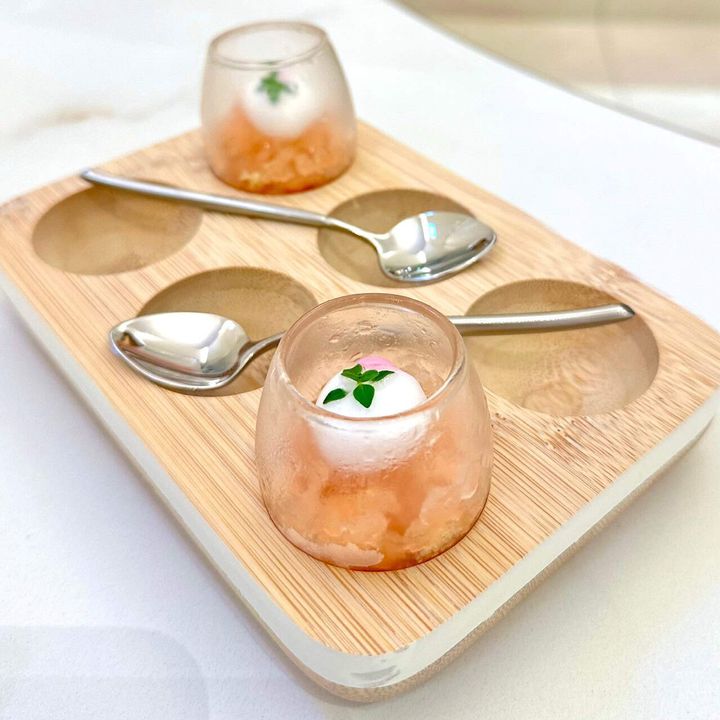 「グレープフルーツ タイム/愛のカタチ」グレープフルーツのグラニテ。エスプーマにしたレモンタイム風味の炭酸をのせて。