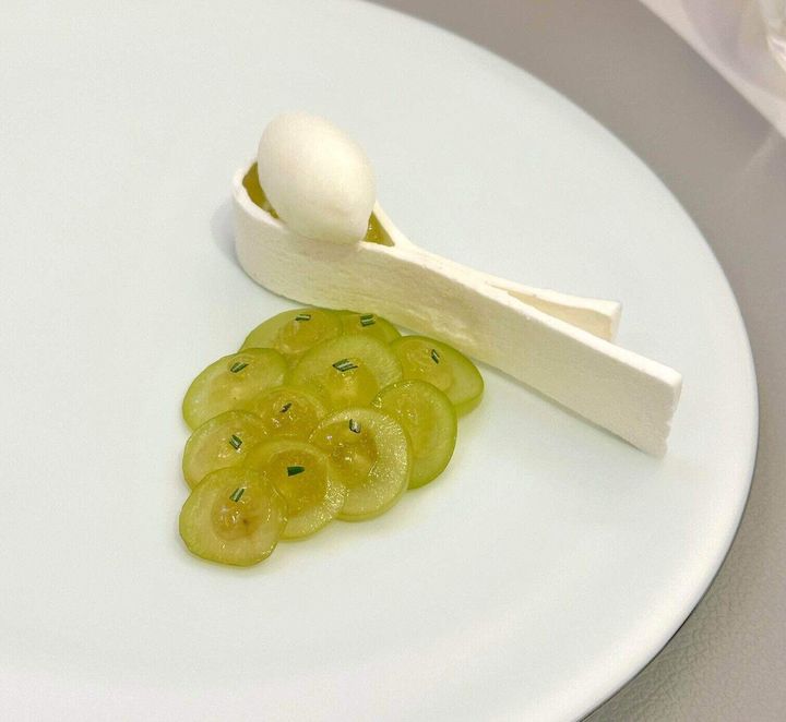 「マスカット メレンゲ/ヨーグルト」スライスしたシャインマスカットに刻んだローズマリーを散らし、ブドウの木に見立てた一品。メレンゲの上にはヨーグルトのソルベを。