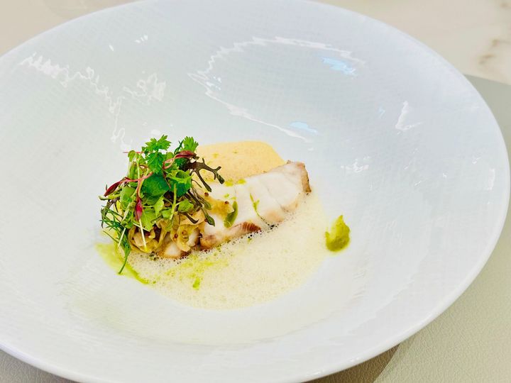 「カボス キャベツ/五島の海」糸島の久保田農園のハーブサラダを添えたマハタのロースト。マハタの出汁を使った白ワインソースとワタリガニのアメリケーネソースでいただきます。カボスのペーストがアクセントに。