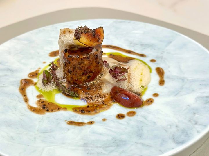 「無花果 里芋/フォアグラ」天草のホロホロ鳥とフォアグラ、里芋を使った温かいテリーヌ。無花果のキャラメリゼやピューレ、無花果の葉からとった緑のオイルなど、無花果をたっぷりと感じる一皿。