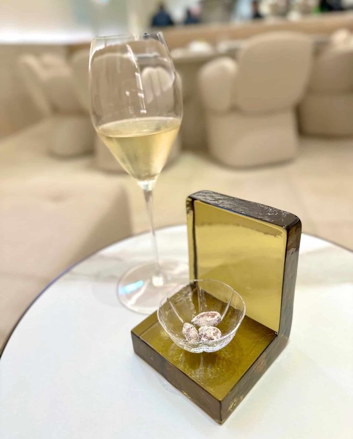 ウェイティングスペースでくつろぎながら、まずはシャンパーニュで乾杯♪これから始まるコースへの期待が膨らみます。