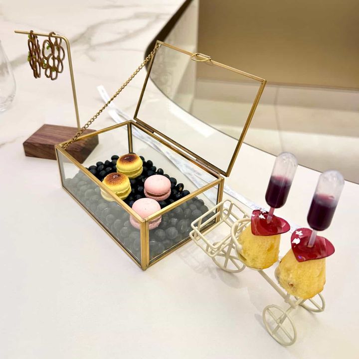 「食前のお愉しみ」イヤリングスタンドに飾られたポルチーニ茸のチュイルや、カレー風味のマカロン、糸島豚のリエットのマカロン、ブドウジュースをスポイトで注入するマドレーヌといった、ひと口サイズのミニャルディーズが食前酒に合わせて並びます。