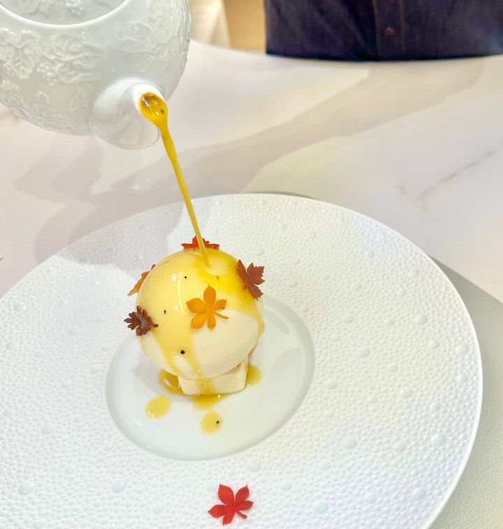 「洋梨 アーモンド/ホワイトチョコレート」球体のホワイトチョコレートに温かなソースをかけると、チョコレートが溶けて中からアイスが登場する楽しい仕掛けのデザート。