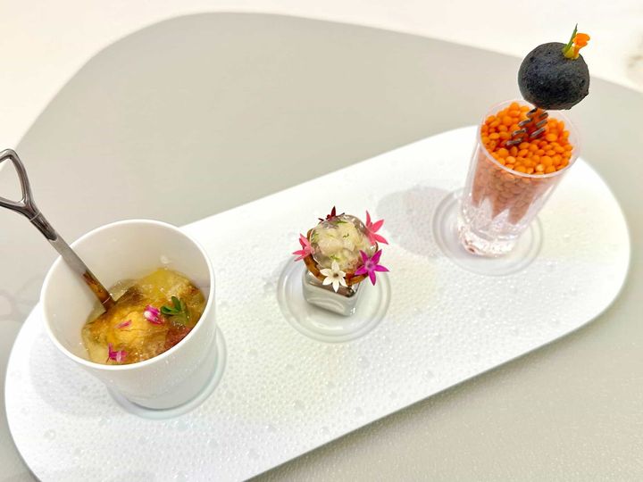 「はじまりの唄」物語のワンシーンのように美しいプチサイズのアミューズ。カリフラワーのムース(左)、車エビと高野豆腐のタルト(中)、魚とジャガイモのフリット(右)。