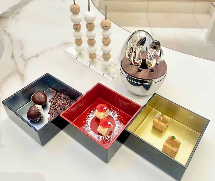 「食後のお愉しみ」ひと口サイズの可愛らしいスイーツが、カラフルなお重に入って登場!クリストフルのカトラリーでいただけます。