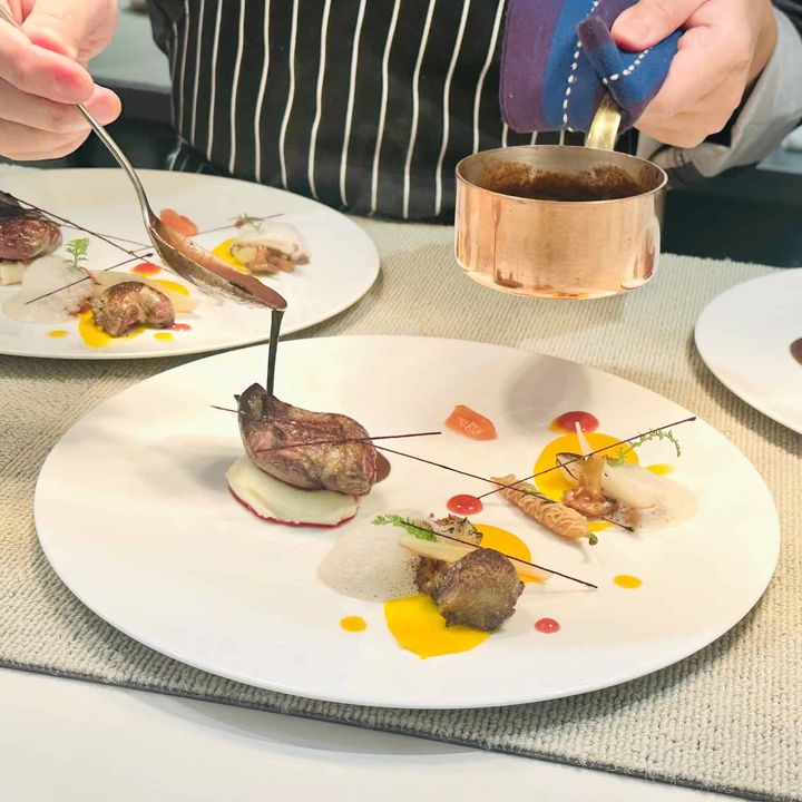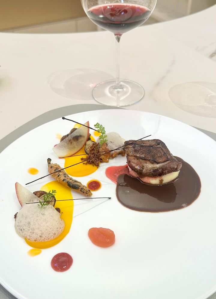「林檎 木の子/仔鳩」ムネ肉とモモ肉、2種類の部位をサルミソ―スでいただく一皿。ニンジンのピューレ、スモモのソース、リンゴのピューレを添えて。