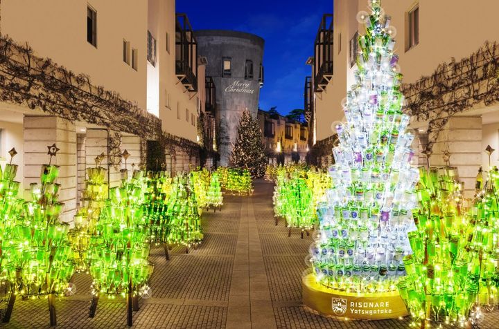 メイン会場となるピーマン通りには、1万2000本の「甲州」のワインボトルをアップサイクルしたツリーが登場。ひときわ輝くメインツリーはなんと高さ3.5m。山梨県のブドウ農家で古くから親しまれてきた一升瓶のワインボトルを使用しています。