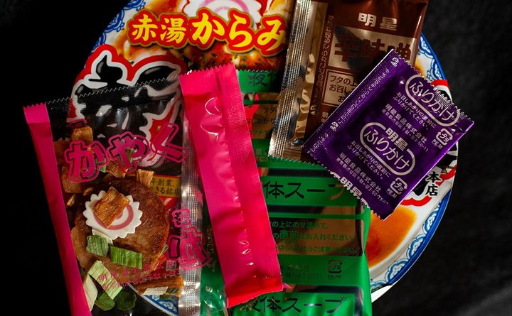 フタを開けると、4つの小袋が出てきました。先入れは「かやく」のみで、残りの液体スープ、辛味噌、ふりかけの3つは後入れです。
