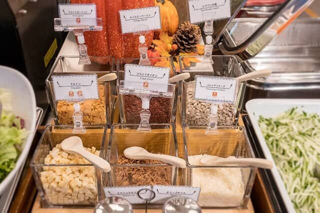 サラダのトッピングが多いのは得した気分。フライドオニオンやパルメザンチーズ、クリスピーベーコン、ひまわりの種など、お好みでトッピングを楽しめます。赤ワインビネガーやバルサミコ酢、エスニックオイルもあり、多彩な味をアレンジできます。