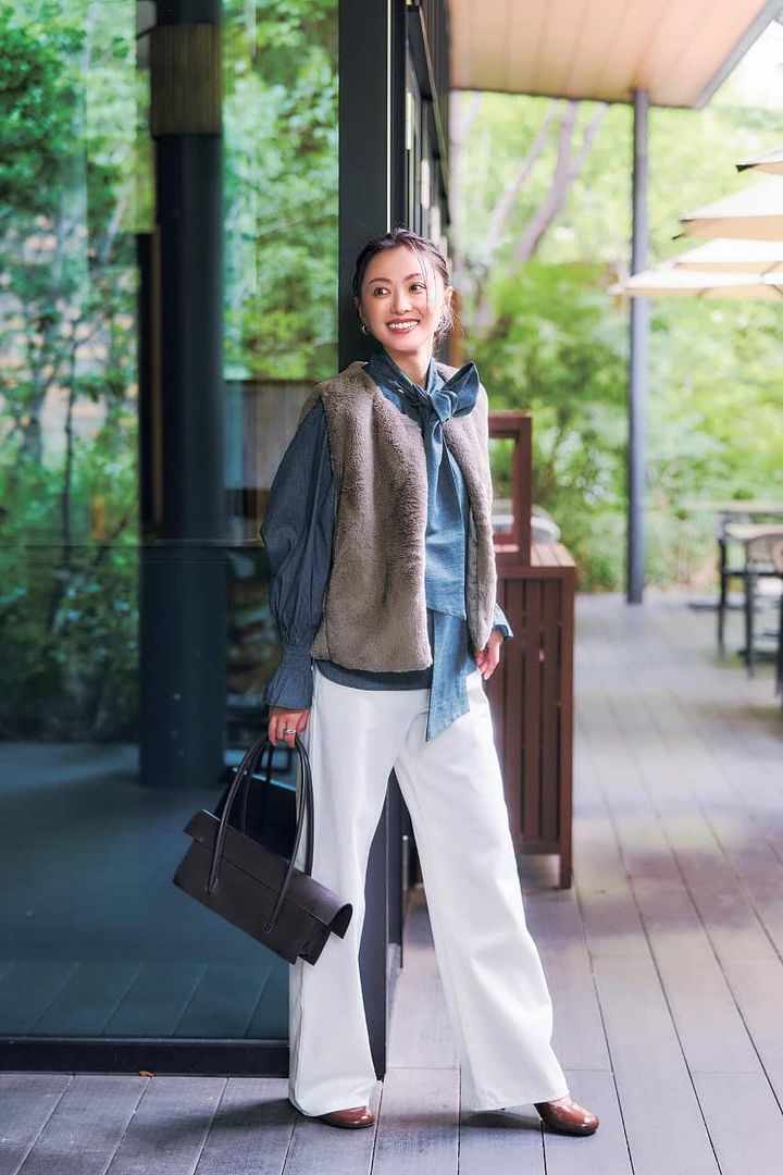 ファーベスト¥25,300(アルページュストーリー)デニムシャツ¥47,300(サクラ/インターリブ)タンクトップ¥19,800(ハイク/ボウルズ)パンツ¥16,500(ico/Siro Co., Ltd.)バッグ※送迎¥17,600(ノマディス/ノーベルバ)バッグ※自分時間¥75,900(ジャンニ キアリーニ/ジャンニ キアリーニ 銀座店)ローファー¥26,950(スタッカート/バロックジャパンリミテッド)イヤリング¥41,800(ブランイリス/ブランイリス トーキョー)