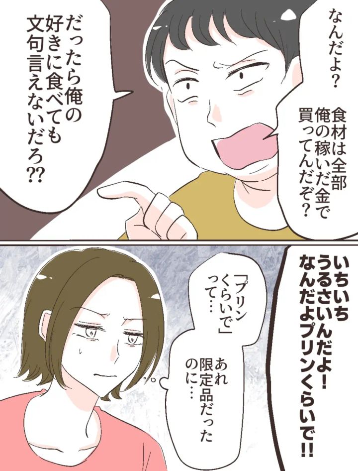 「なんだよ?食材は全部俺の稼いだ金で買ってんだぞ?だったら俺の好きに食べても文句言えないだろ??」と強気のフトシに、「いちいちうるさいんだよ!なんだよプリンくらいで!!」と怒りをぶつけられ、「『プリンくらいで』って・・あれ限定品だったのに・・」と小さな声で呟くことしかできませんでした。