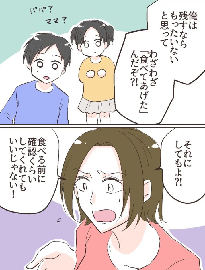 「俺は残すならもったいないと思って、わざわざ『食べてあげた』んだぞ!?」と恩着せがましい口ぶりに、子ども達もちょっぴり不安そう。「それにしてもよ!?食べる前に確認くらいしてくれてもいいじゃない!」私がそう言うと、