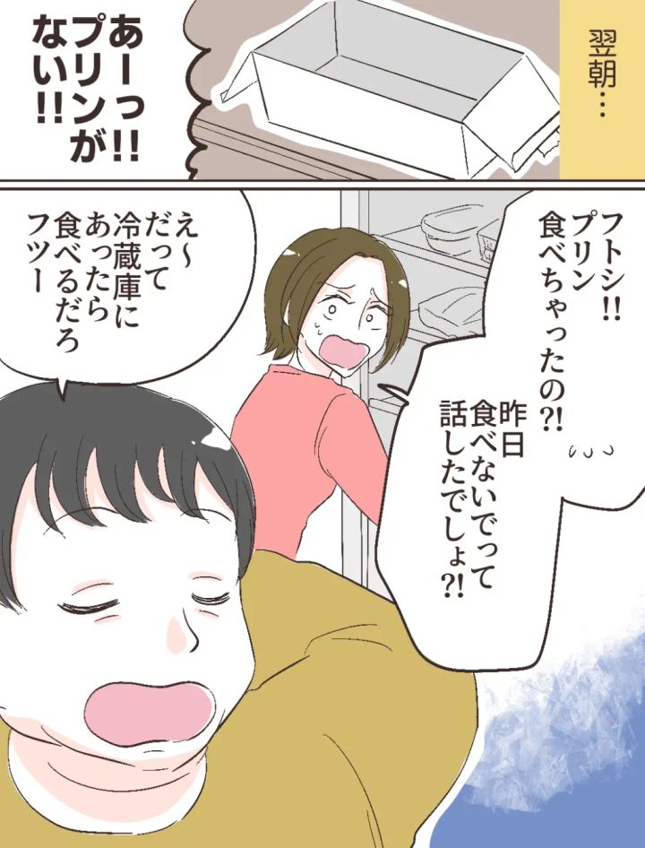 「あーっ!!プリンがない!!」冷蔵庫を見て驚いた私は、「フトシ!!プリン食べちゃったの!?昨日食べないでって話したでしょ!?」と言うと、「え~、だって冷蔵庫にあったら食べるだろフツー」とあっけらかんとしながら答えるフトシ。