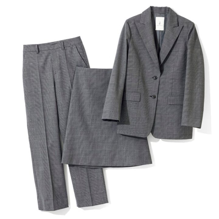 右から、端正な仕立てのよさが際立つきれいなシルエット。今年らしいオーバーサイズでモードっぽく着こなせる。ジャケット8万5800円、体の線を拾わず、大人も美しく安心してはける丈感。レイヤードしたり、ロングブーツを合わせたり、多彩な着こなしが楽しめる。スカート5万600円、スレンダーなラインがスタイリッシュなスリムストレート。ジャケットとの相性も抜群。パンツ5万9400円(すべてジェイドット/ジェイドット 自由が丘八雲店)