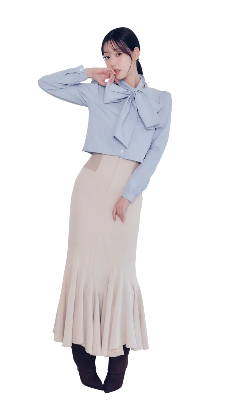 リボンタイシャツ 12,980円/lilLilly(lilLilly TOKYO)マーメイドスカート 13,200円/COCO DEAL(ココ ディール)ロングブーツ 16,900円/チャールズ&キース(チャールズ&キース ジャパン)