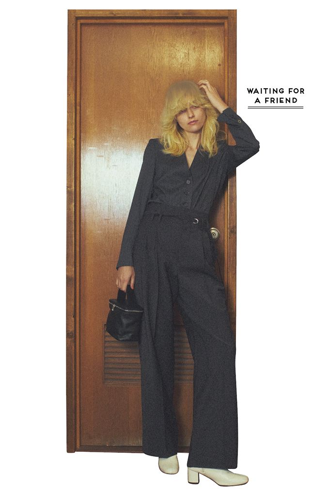 同系色のワイドパンツとつなげて、オールインワンをセルフメイク。薄手かつ横幅が狭めだから、INしたときもウエストまわりがもたつく心配は不要。 グレーピンストライプジャケット/ブリル(ブリル新宿) 黒ベルトつきセンタープレスパンツ/イウエン マトフ(ユナイテッドアローズ 渋谷スクランブルスクエア店)