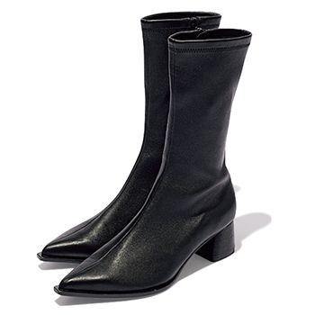 脚に吸いつく、ソフトなストレッチ素材。この「ぴたっとした」フィット感と、脚線をまっすぐ縦に流すミドル丈との相乗効果で、確実な細見えを実現。特筆すべきは、細身パンツの上からかぶせてももたつかない、その柔軟な対応力。安定感のある5cmヒールが、毎日のスタイルアップをストレスなくサポート。