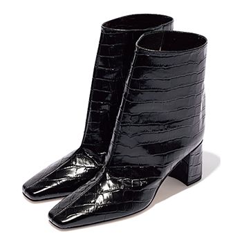重めなボトムスやコートにも負けない、辛口なクロコの型押しと存在感のある太ヒール。甲の中盤から縦に伸びる、締めつけ感のないIラインの筒型は、パンツのブーツINも簡単。シャープなスクエアトゥとのバランスが、タフな中にも洗練さを漂わせる。