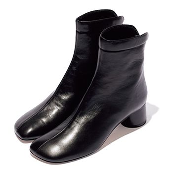 親指側にゆとりを持たせた、ななめにカットしたつま先が今季らしい一足。甲幅が広い人でも窮屈さを感じにくく、しっかりとしたヒールで疲れずにスタイルアップをかなえる。ミニマルな黒レザーで旬なフォルムを上品なムードに。