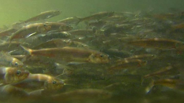 「むかわ町では、鵡川の河口から遡上してきたシシャモを捕獲して、このふ化場に収容します」