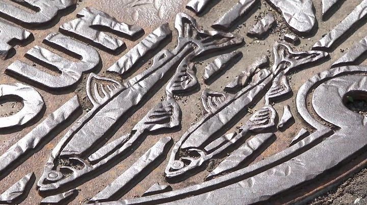 むかわ町を歩いてみると、マンホールの蓋をはじめ、シシャモがデザインされたステンドグラスを施した街灯も。