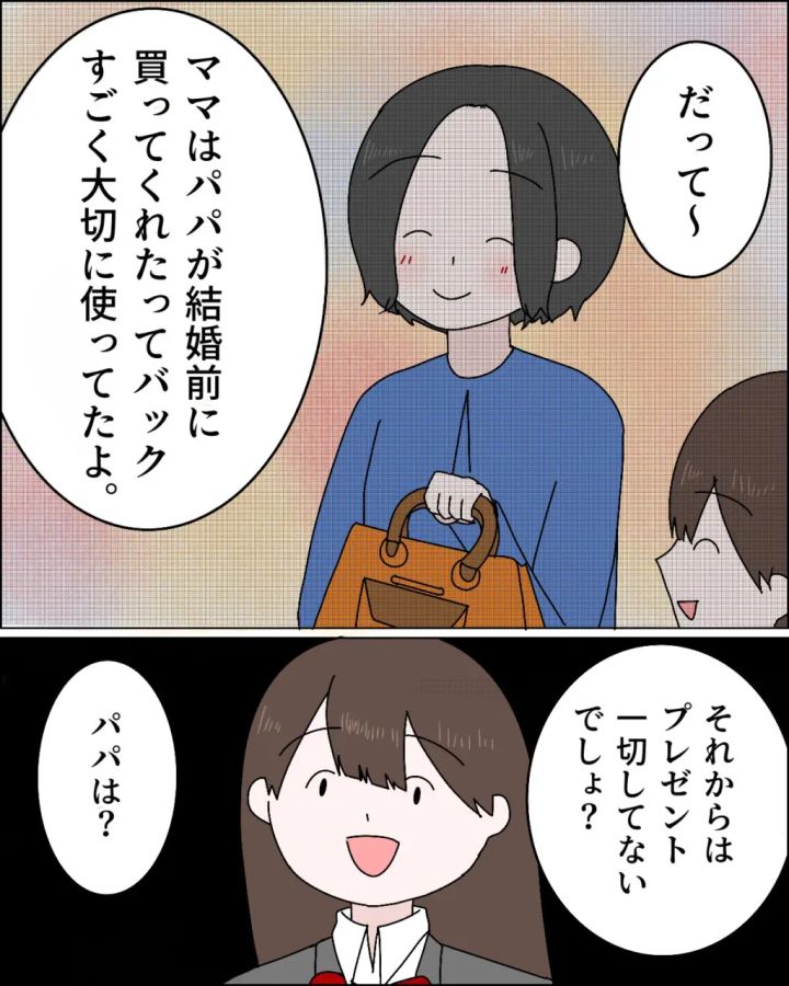 3. 「ブランドバッグ売れば?」自分は贅沢して子どもに我慢させようとする浮気相手にズバッと反論。父の浮気|ママ広場マンガ