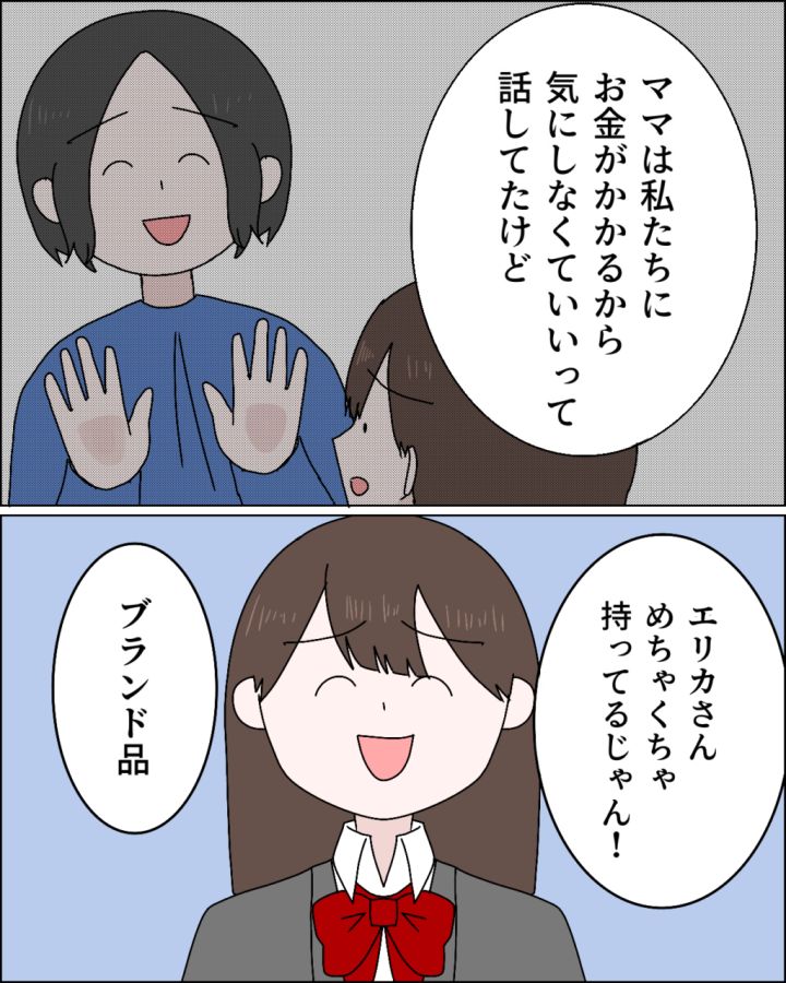 「ママは私たちにお金がかかるから気にしなくていいって話してたけど、エリカさんめちゃくちゃ持ってるじゃん!ブランド品」と、リナさんとエリカさんを比べるジュリちゃん。