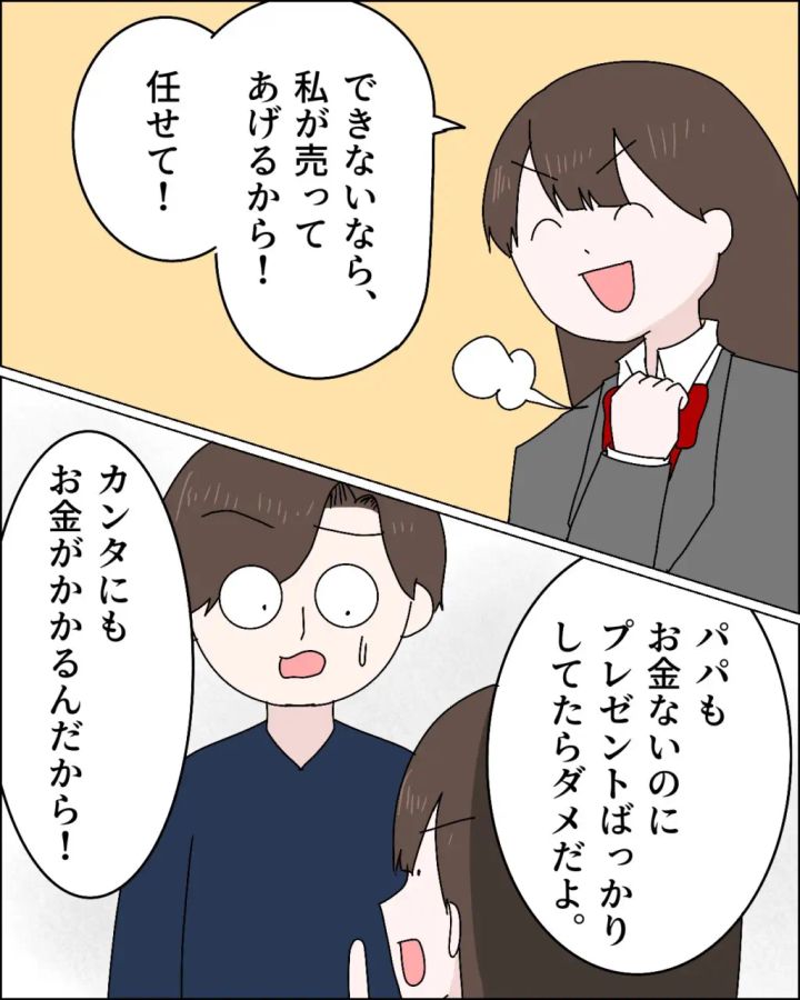 ジュリちゃんは「できないなら、私が売ってあげるから!任せて!」と力強く言うと、「パパもお金ないのにプレゼントばっかりしてたらダメだよ。カンタにもお金がかかるんだから!」とケイさんにお説教。