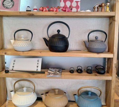 南部鉄器の鉄瓶ですね。私の義実家は岩手県なので黒い鉄瓶は使いましたが、こんな素敵なパステル調もあるとは…。飾りではなく、これでお茶を淹れるそうです。